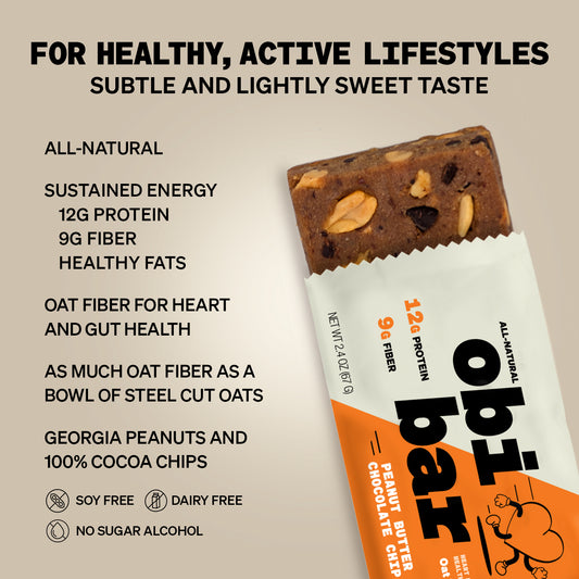 Obi Bar PB Choco Chip - Protein and Oat Fiber Bar | All-Natural, Sustained Energy | Lightly Sweet Taste | 100% Cocoa Chips, Georgia Peanuts | MADE WITH AVOCADO OIL | Egg White Protein | Soy Free, Dairy Free, No Sugar Alcohol, No Seed Oils | 12 Pack
